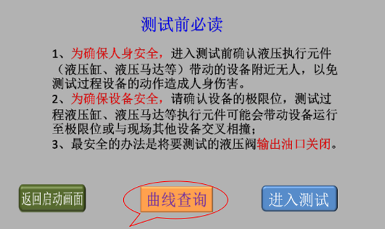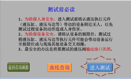 3、確認現(xiàn)場人員和設備安全后,點擊“進入測試”,進入液壓閥測試類型選擇畫面;