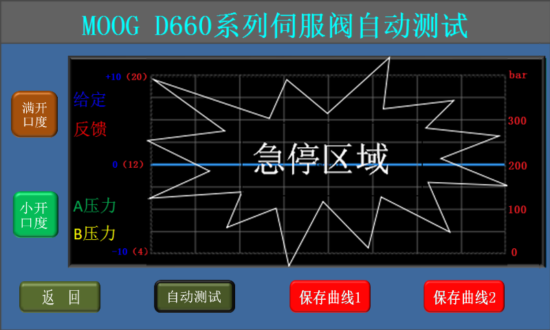 自動(dòng)測試過程中出現(xiàn)緊急情況,可點(diǎn)擊屏幕中間黑色的曲線部分,儀器將給伺服閥斷電,重新選擇開口度后儀器會(huì)再次給伺服閥上電;
