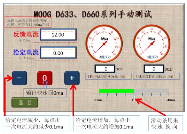 6、伺服閥正常時(shí)的表現(xiàn)為:a、給定電流0ma時(shí),反饋電流在12.00ma,伺服閥輸出的A、B腔壓力相同;b、用滑動(dòng)條可迅速換向,反饋電流改變且A、B腔壓力差較大;c、點(diǎn)擊增加按鈕,反饋電流逐漸增加且A、B腔壓力差逐漸增大;d、點(diǎn)擊減少按鈕,反饋電流逐漸減少且A、B腔壓力差逐漸減少,過0ma后伺服閥會(huì)換向;